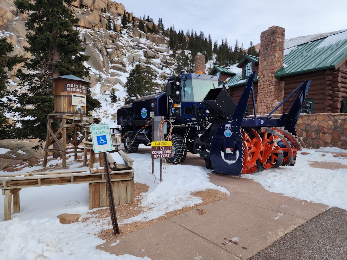 They will check the temperature of your brakes on the way down here. If they are over 300 degrees, you will have to pull off into a parking spot and open your hood for a while until your brakes cool off. As for the visitor's center, it has neat, informative panels outside telling about the history of the race and the mountain. The views are picturesque outside of the visitor's center. You can get food inside the visitor's center. The bathrooms are ok, but nothing to write home about.
